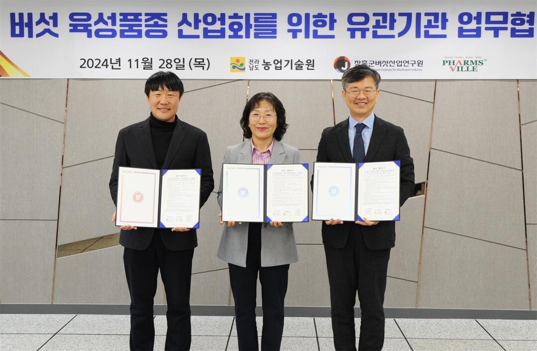 지난달 28일 열린 이날 협약식에는 김행란 전라남도농업기술원장, 김경제 (재)장흥군버섯산업연구원장 직무대리, 이병욱 ㈜팜스빌 대표 등이 참석했다.