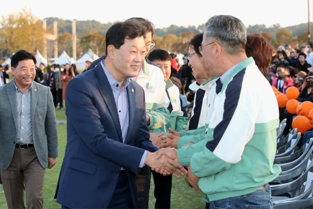| ▲ 지난달 31일 서동욱 전남도의회 의장이 순천만국제정원박람회 폐막식에 참석해 조직위 관계자들과 악수를 하고 있다. [전남도의회 제공] |
