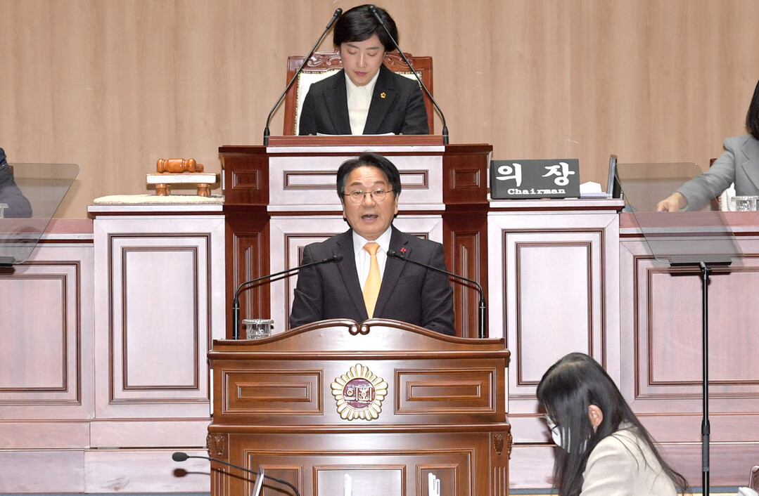 | ▲ 강기정 광주광역시장이 4일 오전 시의회 본회의장에서 열린 제330회 시의회 임시회 제1차 본회의에 참석, 2025년도 주요 업무계획을 발표하고 있다. [광주광역시 제공] |