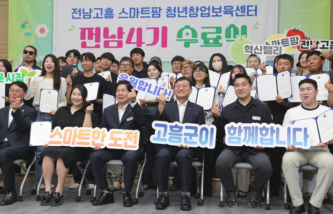 | ▲ 명창환 전남도 행정부지사를 비롯한 주요 참석자들이 23일 고흥 스마트팜 청년창업 보육센터에서 열린 전남 제4기 교육생 수료식에서 기념촬영을 하고 있다. [전남도 제공] |