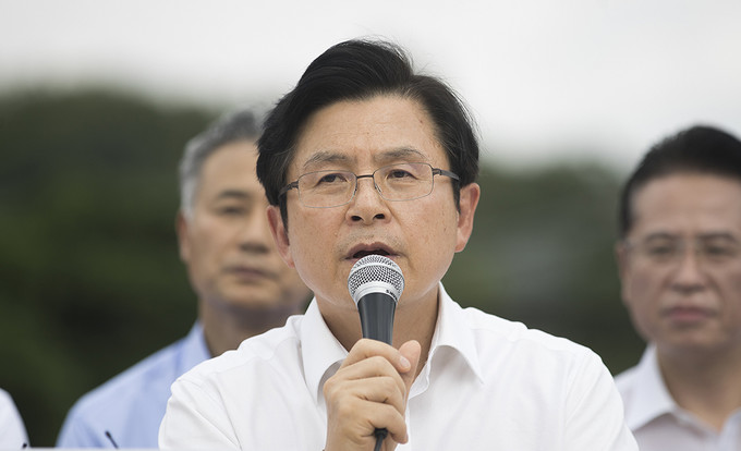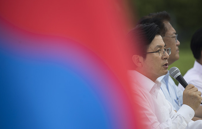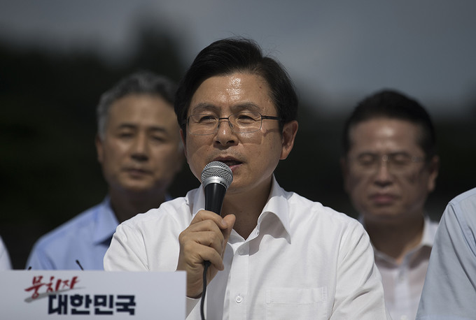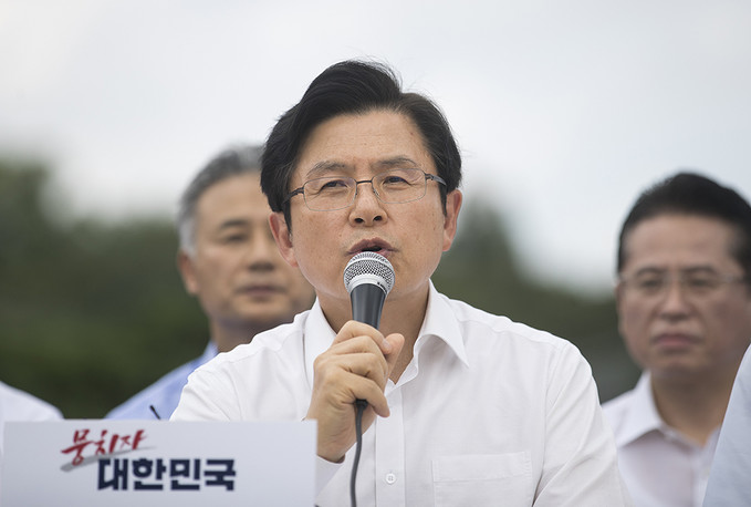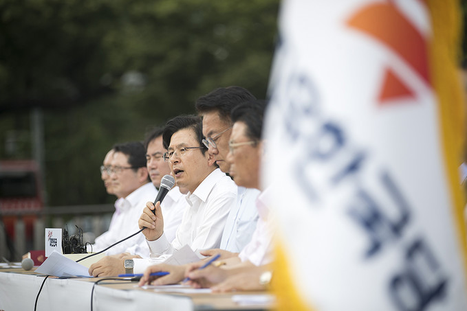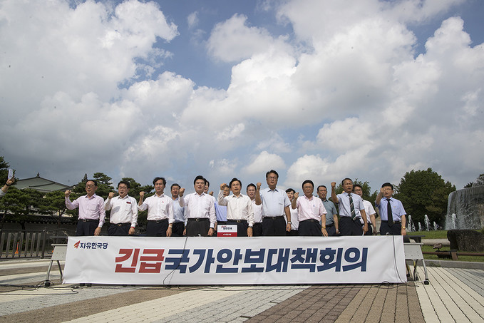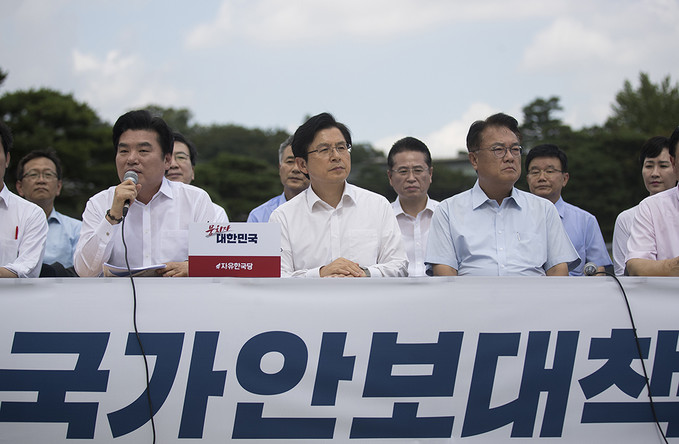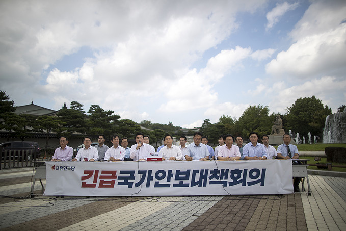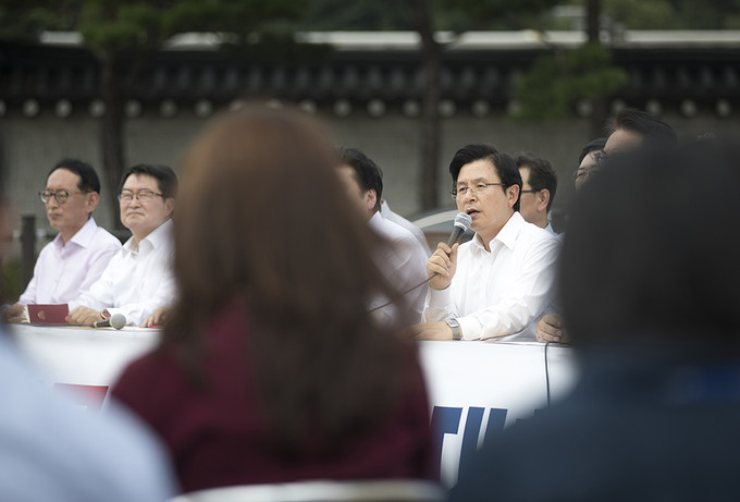 황교안 자유한국당 대표가 16일 오후 서울 종로구 청와대 분수대 앞에서 열린 긴급국가안보대책회의에서 모두발언을 하고 있다.