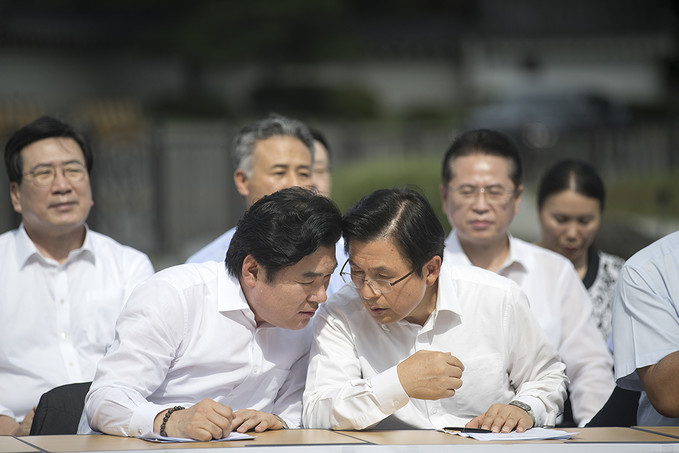 황교안 자유한국당 대표와 원유철 의원이 16일 오후 서울 종로구 청와대 분수대 앞에서 열린 긴급국가안보대책회의에서 대화를 하고 있다.