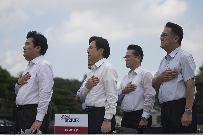 황교안 자유한국당 대표 및 참가자들이 16일 오후 서울 종로구 청와대 분수대 앞에서 열린 긴급국가안보대책회의에 앞서 국민의례를 하고 있다.