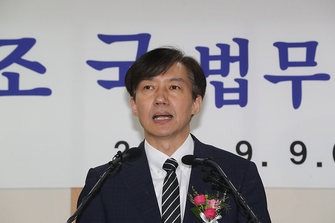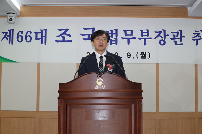 조국 신임 법무부 장관이 9일 오후 경기도 과천시 정부과천청사에서 열린 취임식에서 취임사를 하고 있다.