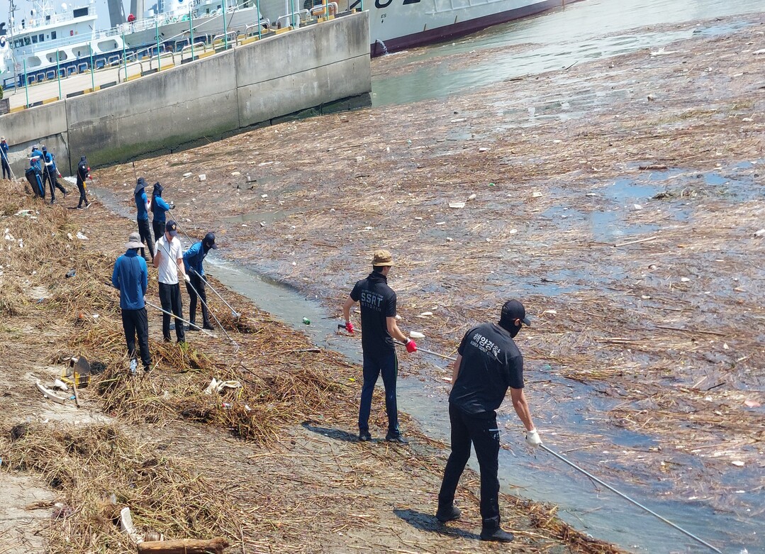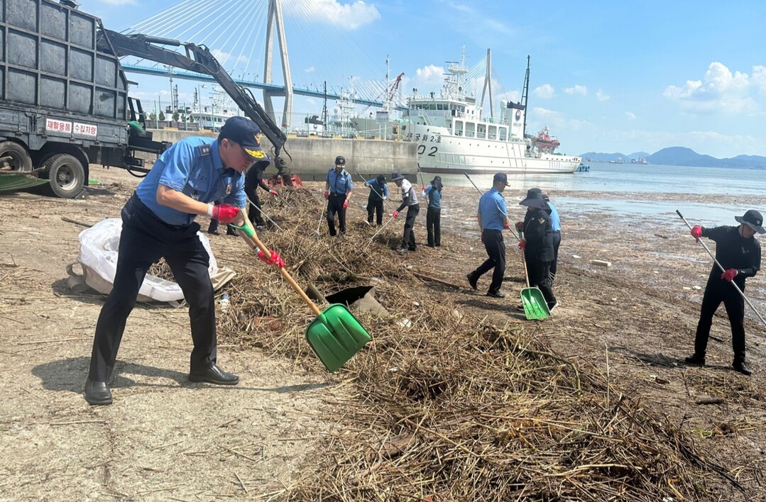 | ▲ 이명준 서해지방해양경찰청장과 직원들이 23일 집중호우의 여파로 해경 전용부두와 목포 동명항 일대에 대량으로 유입된 해양쓰레기를 수거하는 등 해양 피해복구 활동을 진행하고 있다. [서해해경청 제공] |