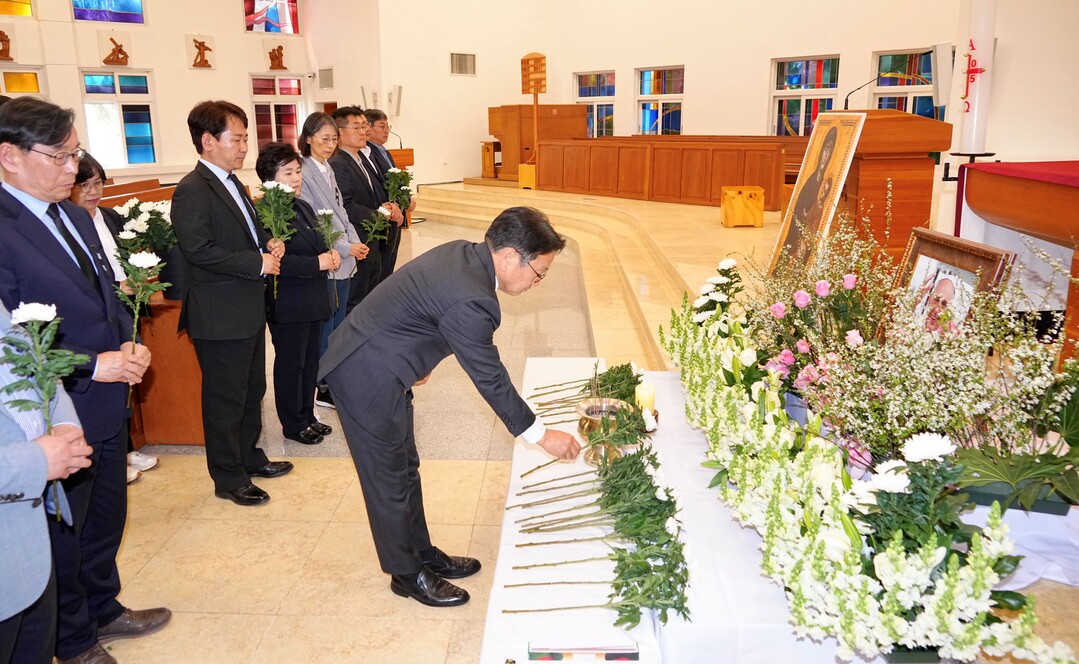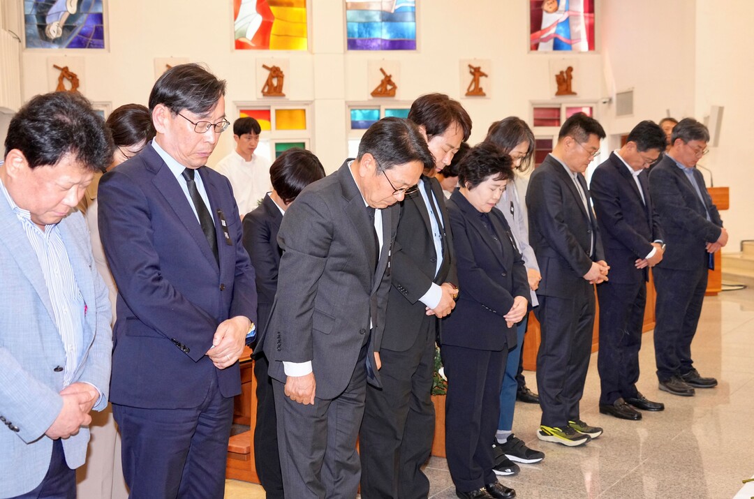 | ▲ 강기정 광주광역시장이 24일 광주시 실국장들과 천주교 광주대교구청 성당에 마련된 프란치스코 교황 분향소를 찾아 조문하고 있다. [광주광역시 제공] |