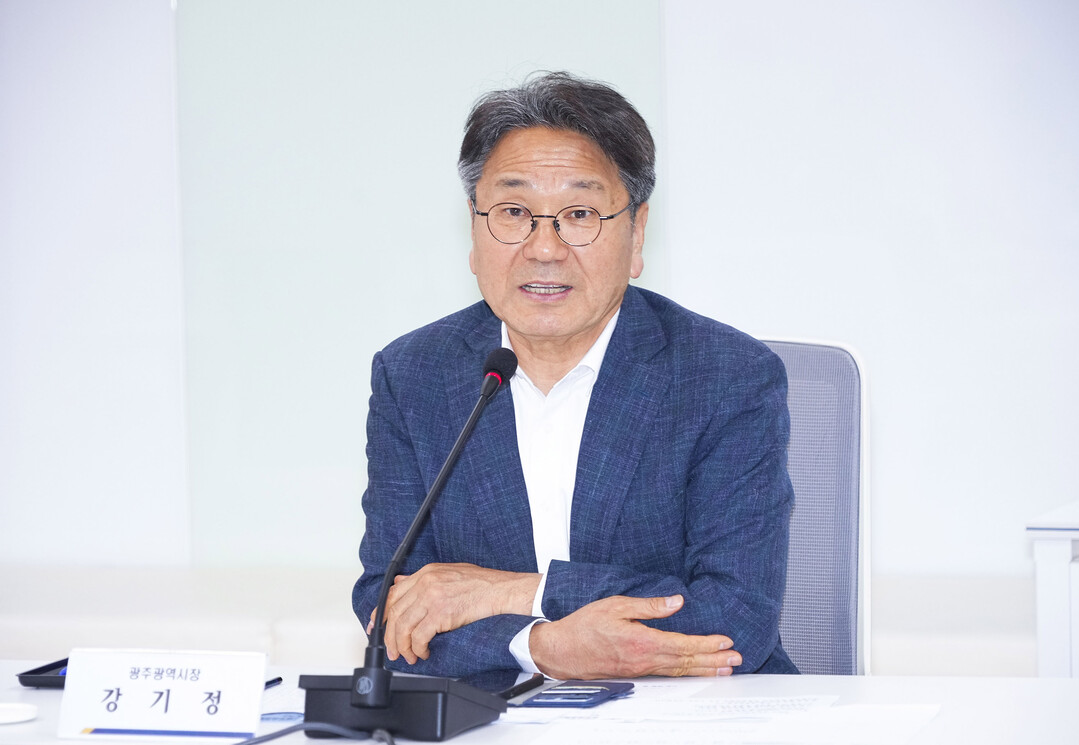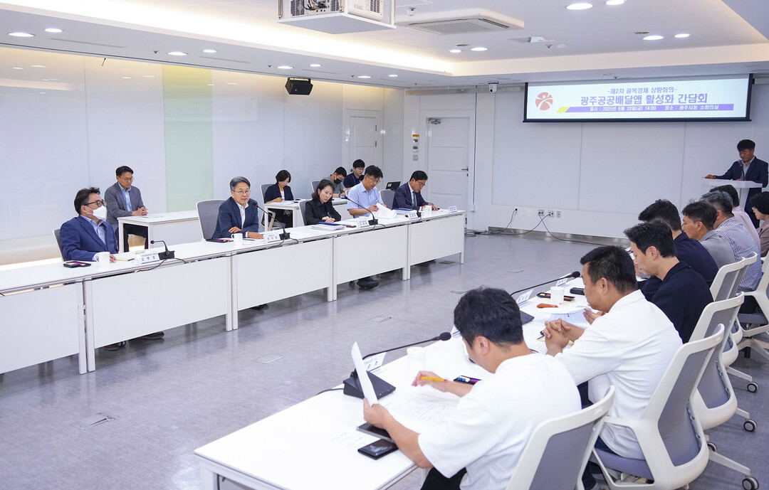 | ▲ 강기정 광주광역시장이 20일 오후 시청 소회의실에서 배달앱 운영사, 가맹점, 라이더 관계자 등과 광주공공배달앱 활성화 방안을 논의하고 있다. [광주광역시 제공] |