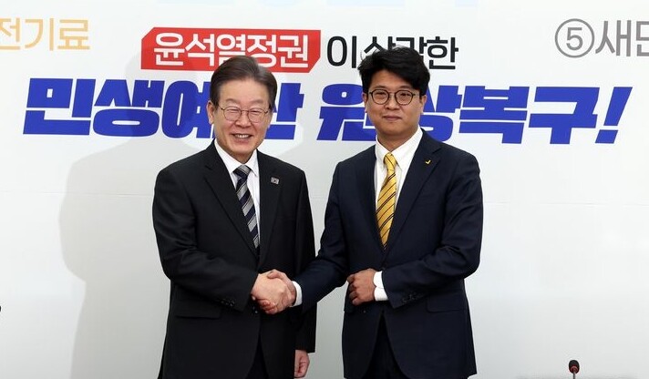 | ▲ 더불어민주당 이재명 대표(왼쪽)가 29일 국회 민주당 대표실을 예방한 정의당 김준우 비대위원장이 악수하고 있다. [뉴시스] |