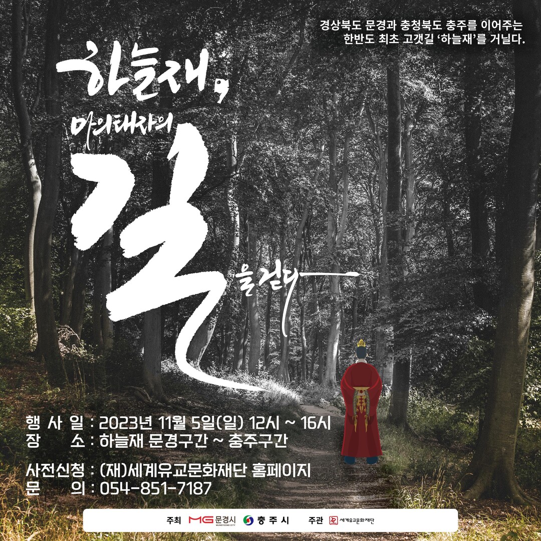 참가자들은 하늘재 코스를 걸으면서 다양한 공연과 마의태자 행렬 퍼포먼스 등 다양한 행사를 즐길 수 있다. 또 추가 행사로 양평의 용문사까지 자전거 순례를 진행한다. 참가를 원하는 시민은 (재)세계유교문화재단 홈페이지에서 신청하면 된다. 행사는 300명 선착순으로 진행된다.