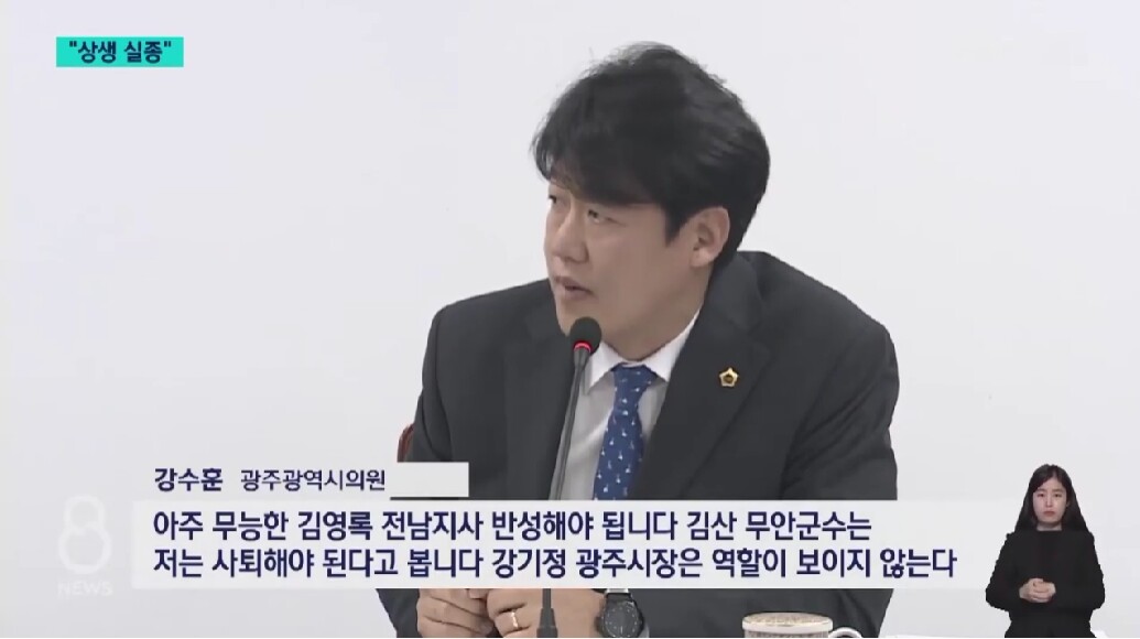 강수훈 광주시의원은 지난 8일 광주군공항이전본부의 행정사무감사에서 "아주 무능한 김영록 전남지사는 반성해야 됩니다. 김산 무안군수는 사퇴해야 된다고 봅니다"고 발언했다.