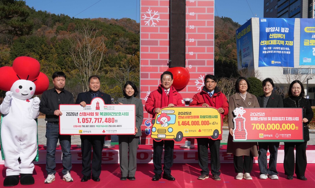 | ▲ 김영록 전라남도지사가 1일 전남도청 광장에서 열린 '희망 2026 나눔캠페인' 출범식과 사랑의 온도탑 제막식에서 관련기관(6개소)에게 배분금을 전달하고 기념촬영을 하고 있다. [전남도 제공] |