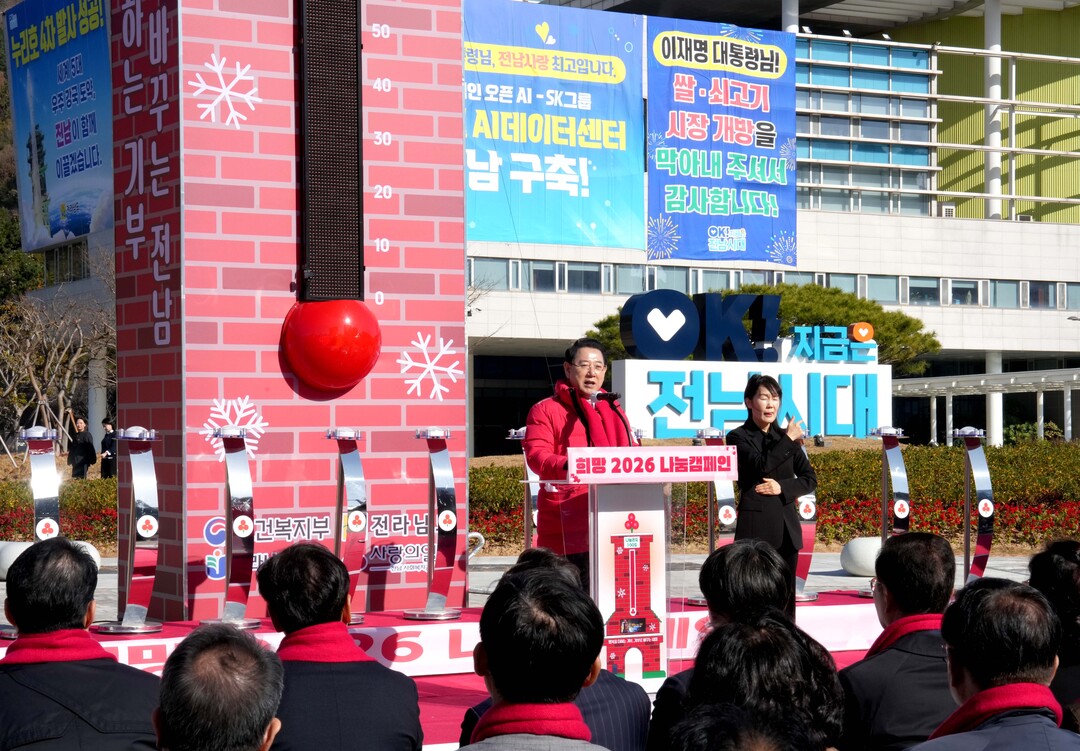 | ▲ 김영록 전라남도지사가 1일 전남도청 광장에서 열린 '희망 2026 나눔캠페인' 출범식과 사랑의 온도탑 제막식에서 희망메시지를 전하고 있다. [전남도 제공] |