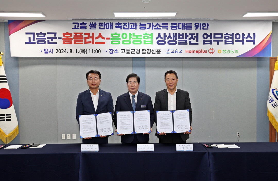 | ▲ 1일 공영민 전남 고흥군수가 팔영산홀에서 국내 최고 유통업체인 홈플러스와 흥양농협이 함께 고흥 쌀 판매 촉진과 농가 소득증대를 위한 3자 업무협약을 체결했다. [고흥군 제공] |