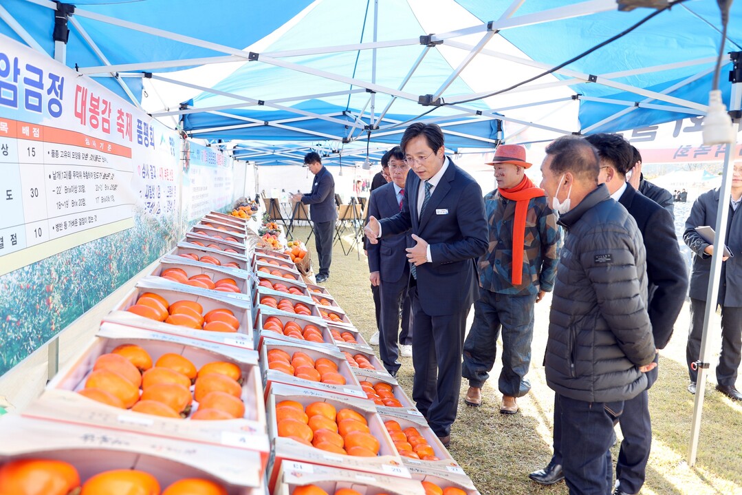 | ▲ 우승희 영암군수가 지난 10일 열린 금정 대봉감 축제를 방문해 대봉감을 살펴보고 있다. [영암군 제공] |