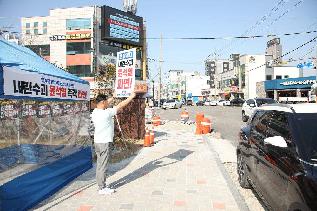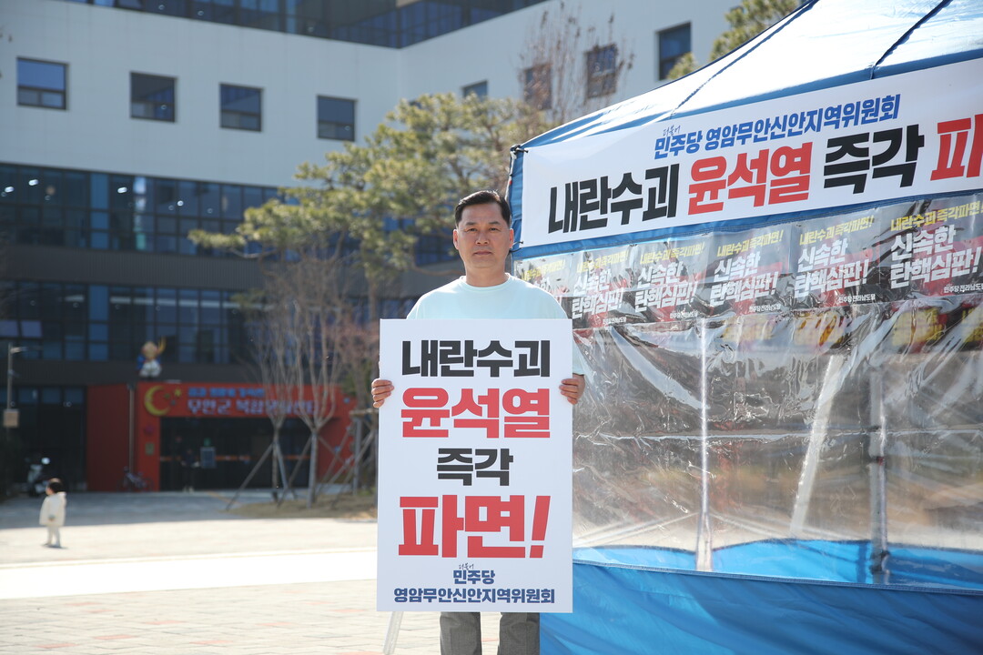 | ▲ 이호성 무안군의회 의장이 14일 오후 무안읍 보건소 사거리에서 윤석열 대통령 탄핵을 촉구하는 1인 시위를 벌이고 있다. 이 의장은 '내란수괴 윤석열 즉각 파면' 피켓을 들며 군민을 향해 호소했다. [독자 제공] |