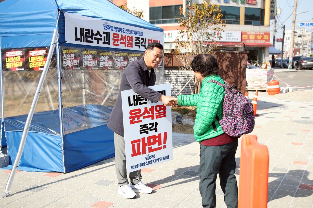 | ▲ 이호성 무안군의회 의장이 14일 오후 무안읍 보건소 사거리에서 윤석열 대통령 탄핵을 촉구하는 1인 시위를 벌이다 군민과 악수하며 호소를 하고 있다. [독자 제공] |