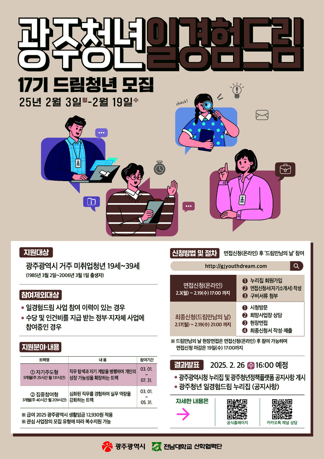 문의는 카카오톡채널 '광주청년드림'과 광주청년 일경험드림 사업단으로 하면 된다.