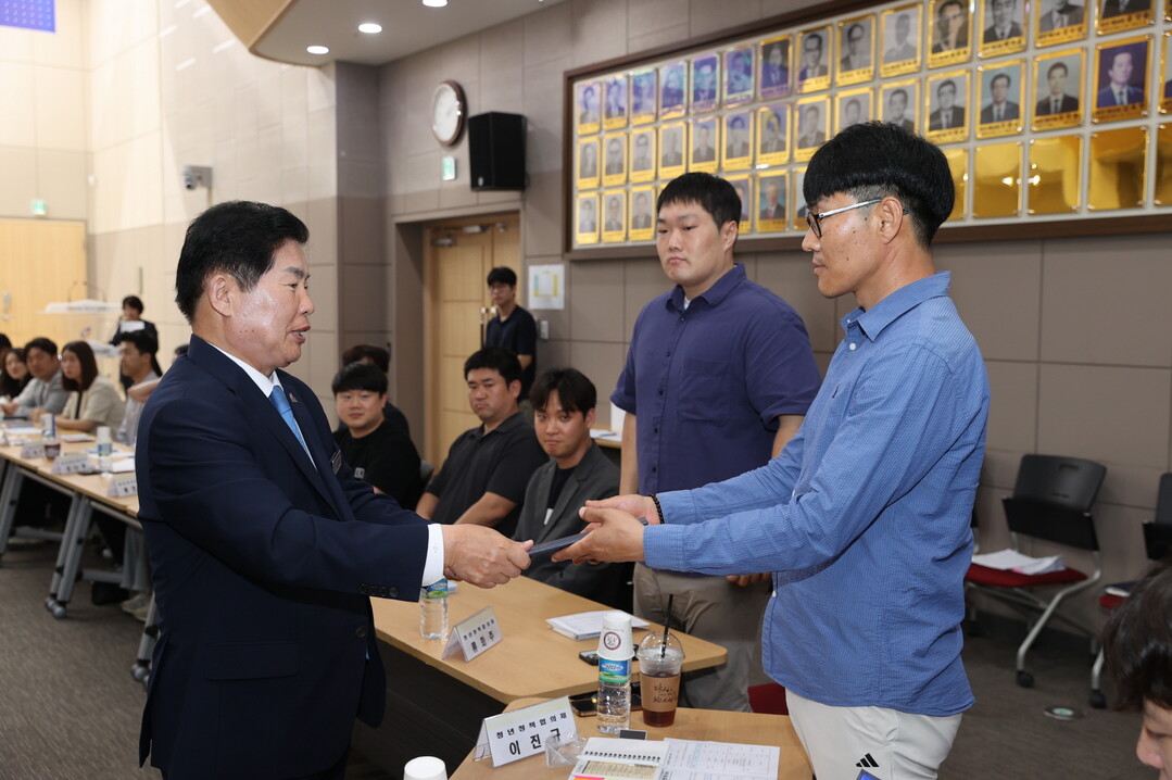 | ▲ 공영민 전남 고흥군수가 지난 21일 군청에서 청년 정책의 수립·집행·평가 전 과정에 청년이 직접 참여하는 청년정책협의체 위원에게 임명장을 전달하고 있다. [고흥군 제공] |