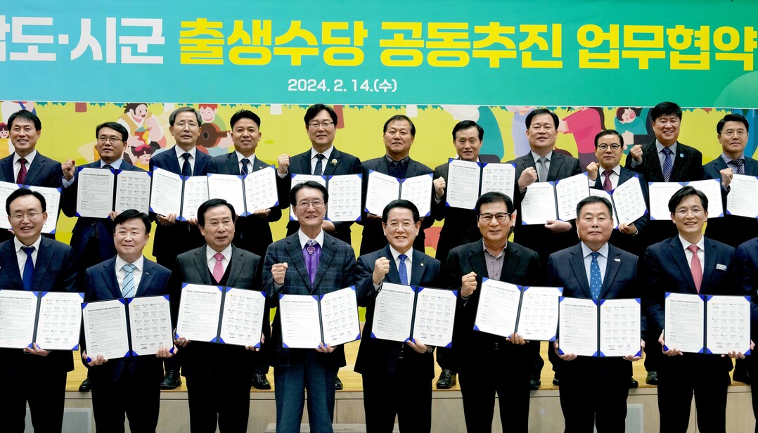 | ▲ 김영록 전라남도지사가 지난해 2월14일 도청에서 22개 시장·군수와 전남 시군 출생수당의 성공적 추진을 위해 업무협약을 하고 있다. [전남도 제공] |