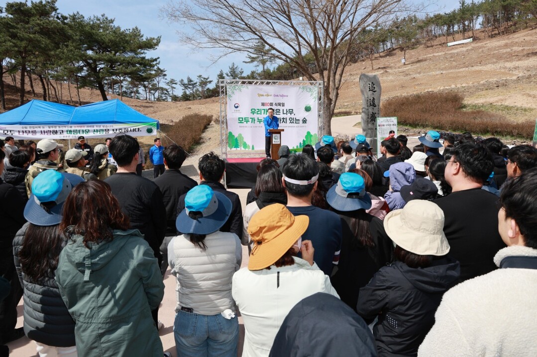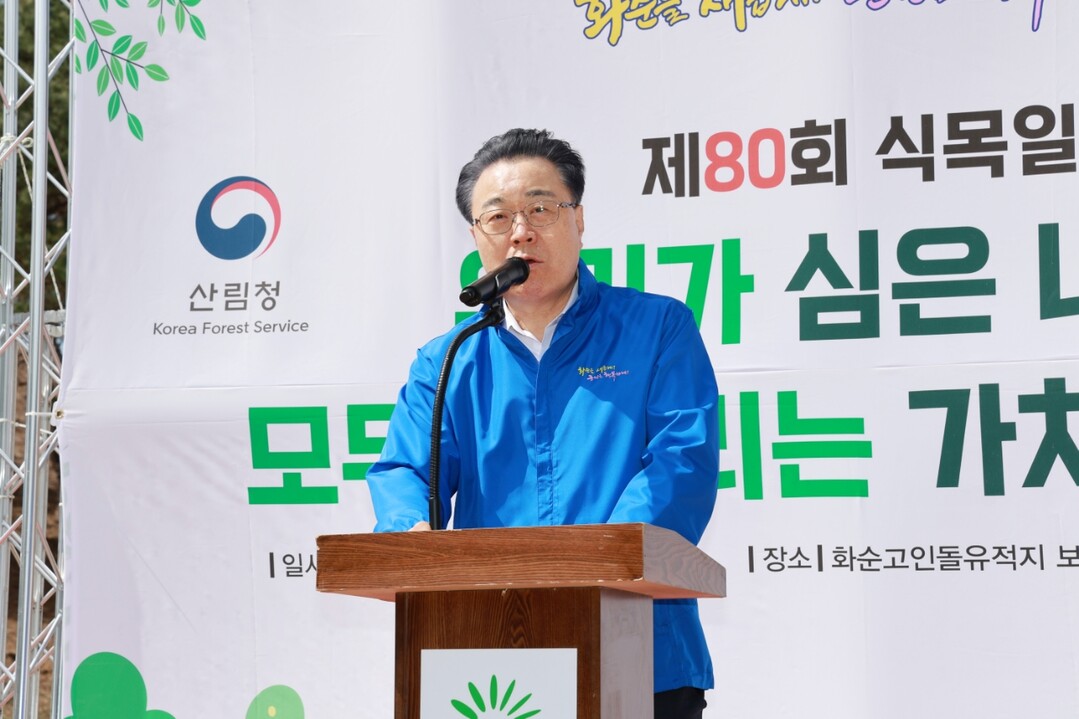 | ▲ 구복규 전남 화순군수가 지난 28일 식목일을 기념해 춘양면 대신리 임야 1.5ha에 매화나무 2000그루를 심기 전 인사말을 하고 있다. [화순군 제공] |