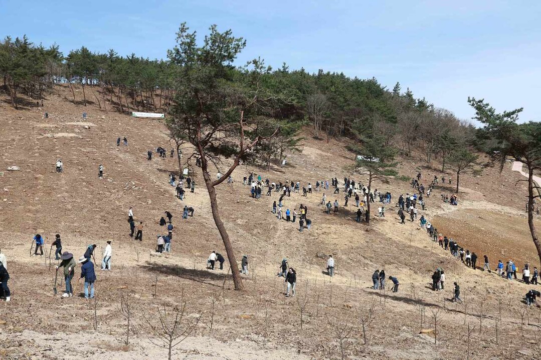 | ▲ 구복규 화순군수와 화순군 의회, 화순 소방서 등 주민 450여 명이 지난 28일 식목일을 기념해 춘양면 대신리 임야 1.5ha에 매화나무 2000그루를 심고 있다. [화순군 제공] |