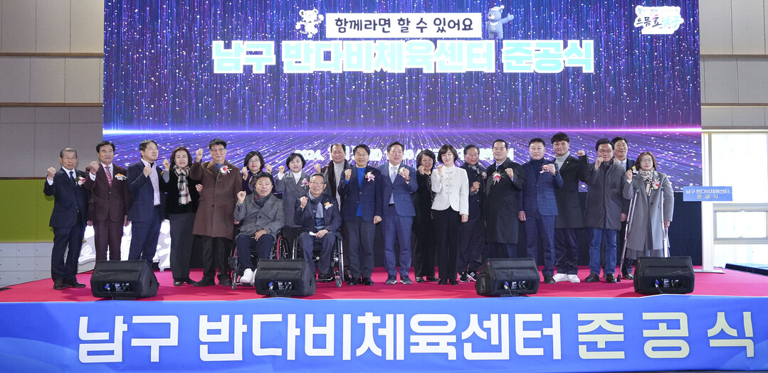 | ▲ 강기정 광주광역시장이 15일 오후 남구 반다비체육센터 준공식에 참석해 김병내 남구청장 등 내빈들과 기념촬영을 하고 있다. [광주광역시 제공] |