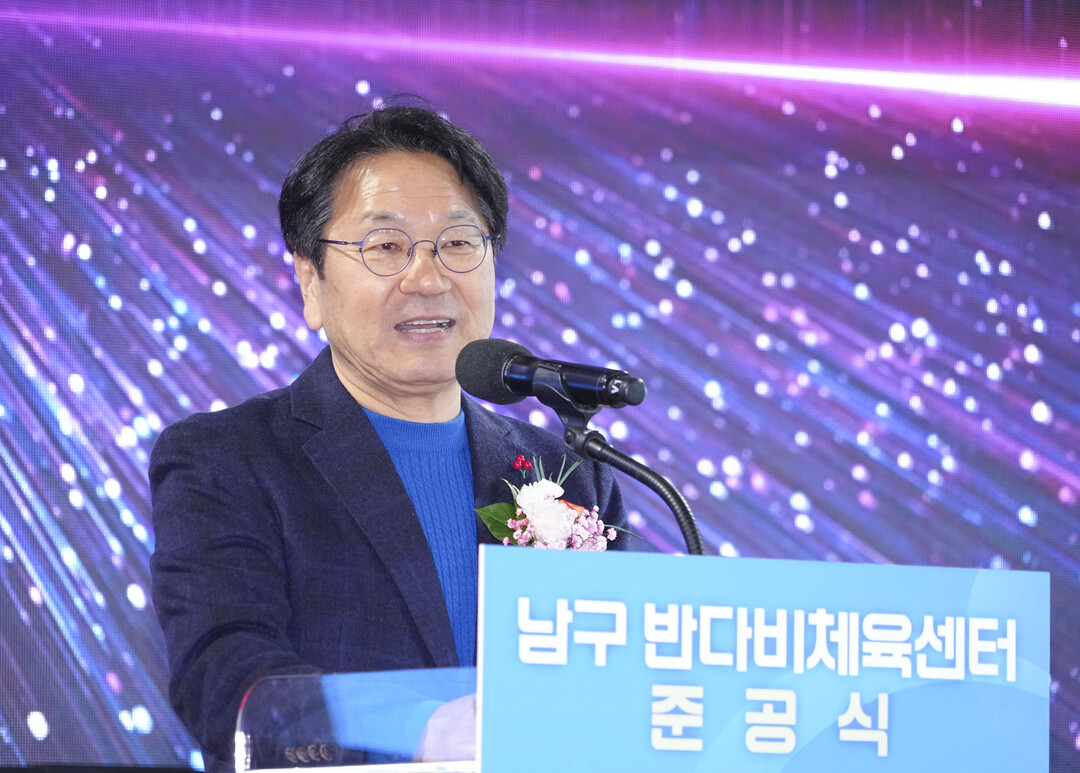| ▲ 강기정 광주광역시장이 15일 오후 남구 반다비체육센터 준공식에 참석해 축사를 하고 있다. [광주광역시 제공] |