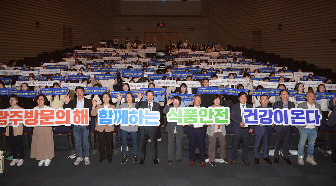 | ▲ 고광완 광주광역시 행정부시장이 14일 오후 시청 대회의실에서 열린 제24회 식품안전의 날 기념식에 참석해 참석자들과 함께 퍼포먼스를 하고 있다. [광주광역시 제공] |