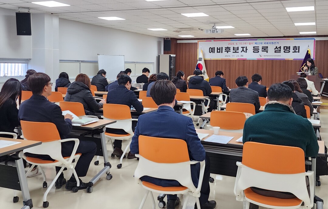 세종시선거관리위원회는 제22대 국회의원 선거를 앞두고 23일 오후 세종시선관위 2층 대회의실에서 예비후보자등록 설명회를 개최했다.