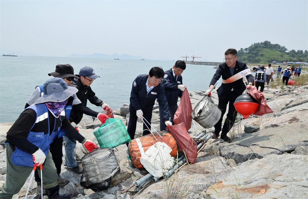 | ▲ 김성 전남 장흥군수가 바다환경지킴이 등 직원 100여 명과 함께 지난달 28일 관산읍 삼산 방조제 일원에서 '제30회 바다의 날' 행사를 맞아 바다의 소중함을 되새기기 위한 해양 쓰레기 줍기에 나서고 있다. [장흥군 제공] |