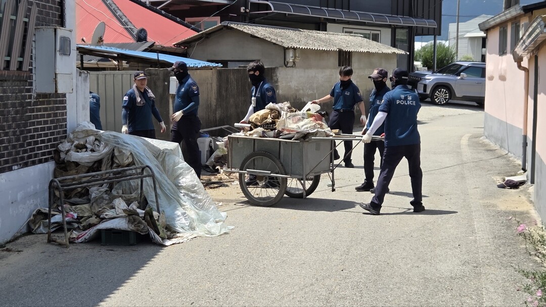 | ▲ 전남경찰청 기동대원 70명이 지난 22일 기록적 폭우로 피해를 입은 담양군 무정면과 대전면에서 침수 가옥 정리 등 긴급 수해복구 지원에 나서고 있다. [전남경찰청 제공] |