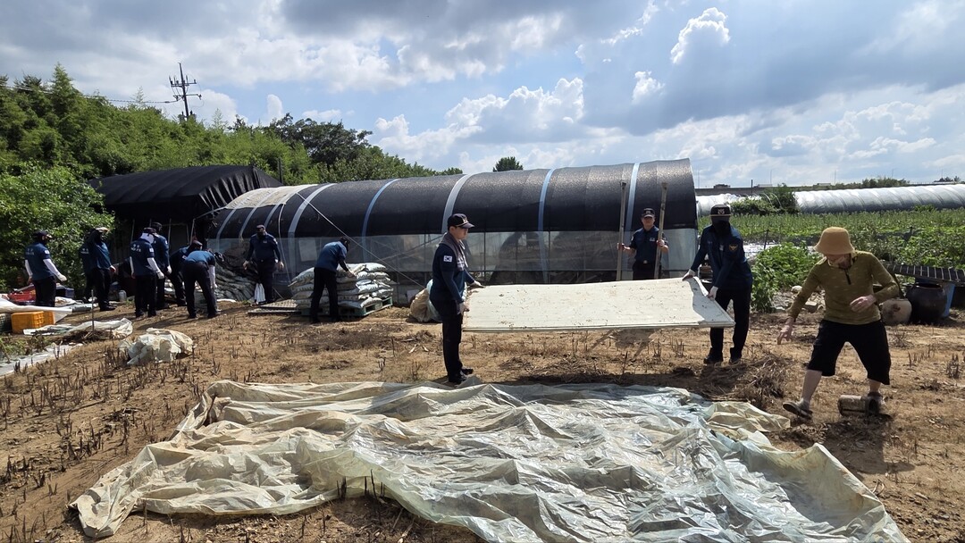 | ▲ 전남경찰청 기동대원 70명이 지난 22일 기록적 폭우로 피해를 입은 담양군 무정면과 대전면에서 피해농가 비닐하우스 정비 등 긴급 수해복구 지원에 나서고 있다. [전남경찰청 제공] |