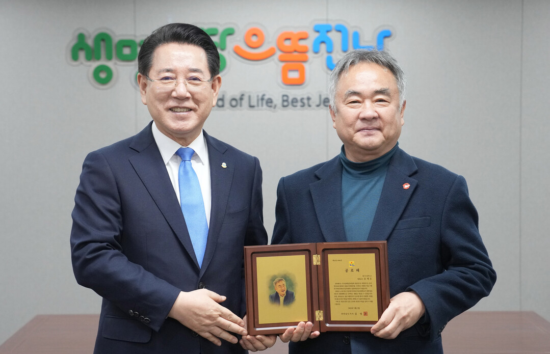 | ▲ 김영록 전라남도지사가 5일 전라남도 서울 중앙협력본부에서 한국에너지공대 설립 지원 유공자인 송재호 제주대학교 명예교수에게 공로패를 수여하고 있다. [전남도 제공] |