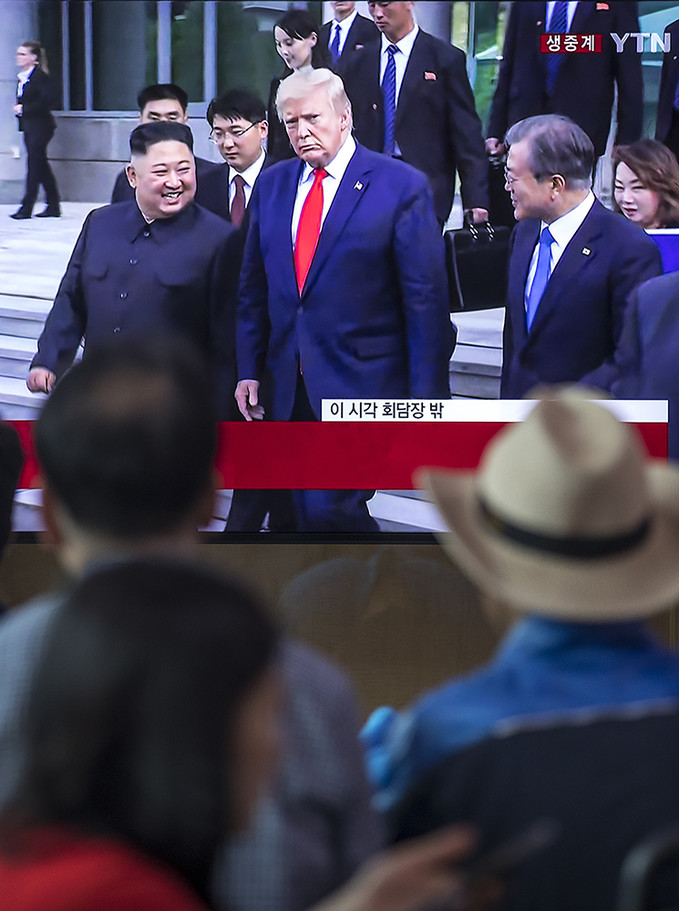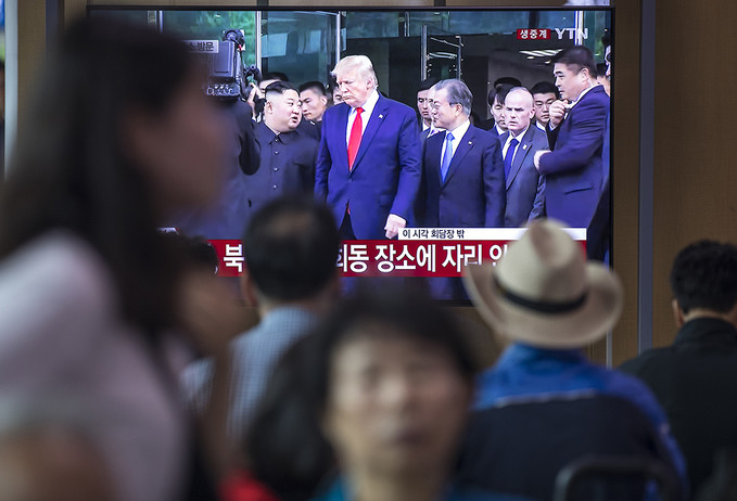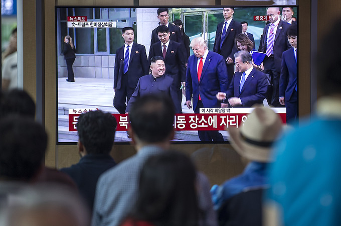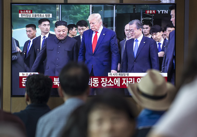 30일 오후 서울 용산구 서울역 대합실에서 시민들이 회담을 마친 도널드 트럼프 미국 대통령과 김정은 북한 국무위원장, 문재인 대통령이 자유의 집을 나서는 모습을 TV를 통해 지켜보고 있다.