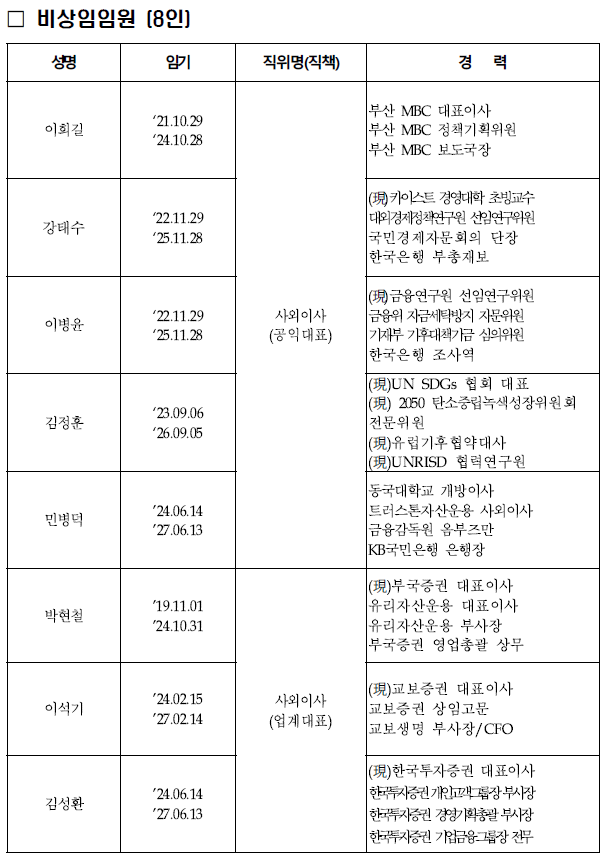 업계대표 사외이사로 선임된 김 사외이사는 1969년생으로 고려대학교 경제학과를 졸업하고 건국대학교 부동산대학원 석사, 박사 학위를 취득했다. 한국투자증권 IB그룹장 전무, 경영기획총괄 부사장, 개인고객그룹장 부사장을 거쳐 현재 한국투자증권 대표이사로 재임 중이다.