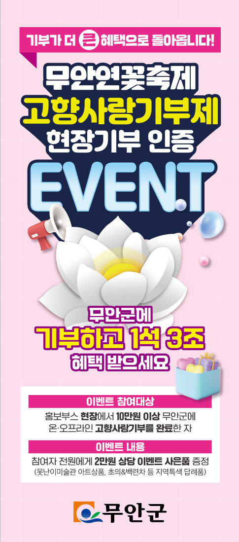 전남 무안군이 제27회 무안연꽃축제 기간인 오는 25일부터 나흘 동안 축제장 고향사랑기부제 홍보부스에서 사은품을 추가 증정하는 이벤트를 운영한다.
