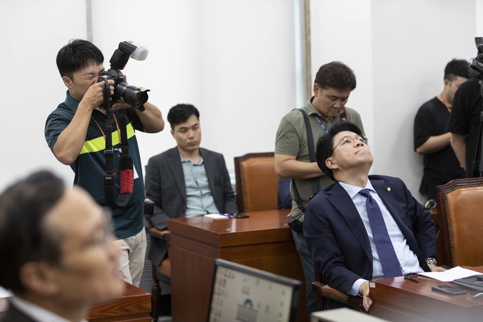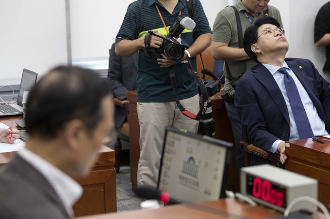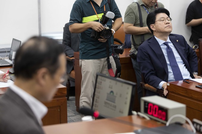 자유한국당 장제원 간사(오른쪽)가 20일 오후 서울 여의도 국회에서 열린 정개특위(정치개혁특별위원회)회의에 참석, 천장을 보며 한숨을 쉬고 있다.