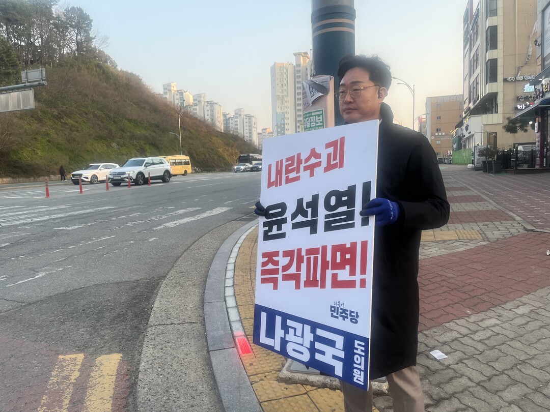 | ▲ 나광국 (더불어민주당, 무안2) 전라남도의회 예결위원장이 지난 20일 무안군 남악리 사거리에서 '내란수괴 윤석열 즉각파면' 팻말을 들고 퇴근길 파면 촉구 1인 시위를 벌이고 있다. [강성명 기자] |