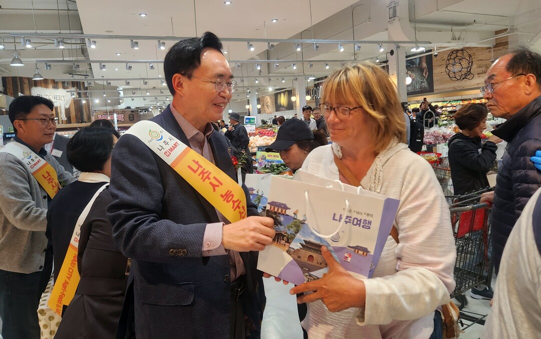 | ▲ 윤병태 나주시장이 미국 뉴저지 H마트 리지필드점에서 나주 농산물 홍보판촉 활동을 하고 있다. [나주시 제공] |