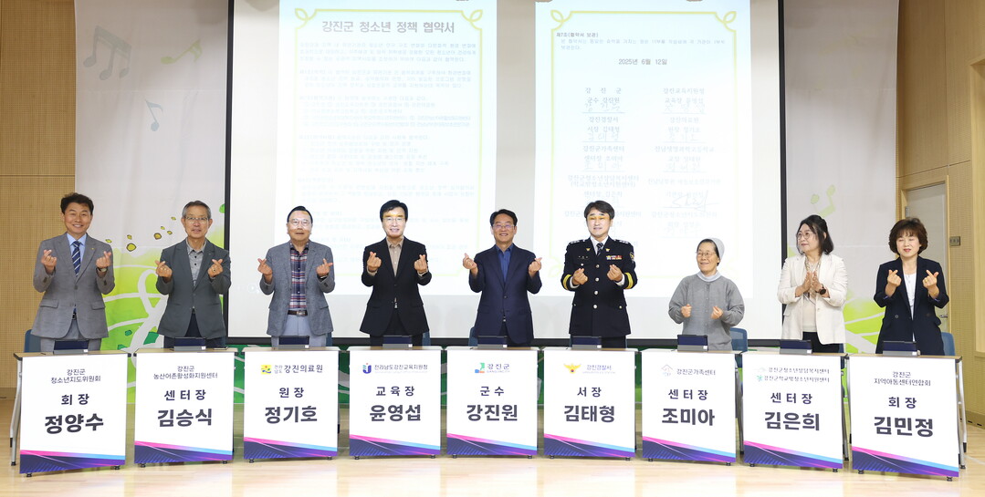 강진군은 지난 12일 지역 청소년과 외국 유학생이 함께 성장하는 글로벌 공동체 조성을 목표로 강진교육청 등 11개 기관과 '청소년 정책 협약식'을 개최했다고 15일 밝혔다.