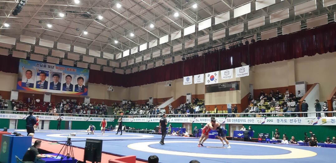 | ▲ 함평문화체육센터에서 제104회 전국체전 레슬링 경기가 펼쳐지고 있다. [함평군 제공] |