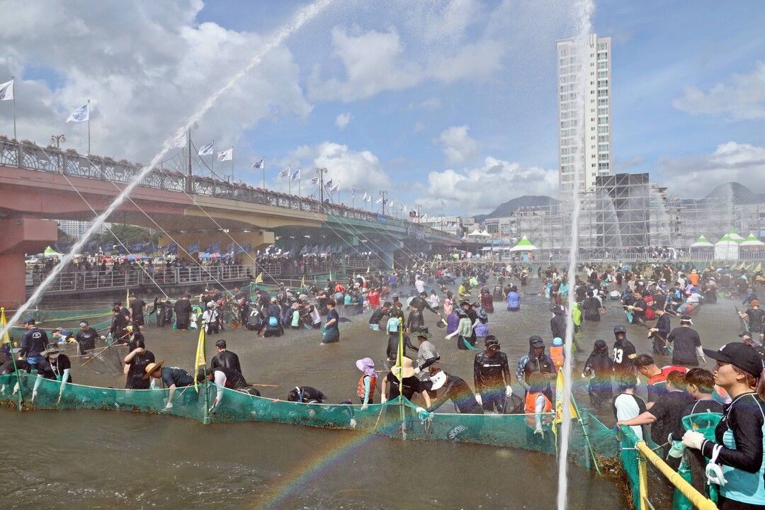 | ▲ 정남진 장흥 물축제 '황금물고기 잡기' 현장, 물속에서 빠르게 헤엄치는 물고기를 잡기 위해 관광객들이 치열한 추격전을 펼치고 있다. [장흥군 제공] |