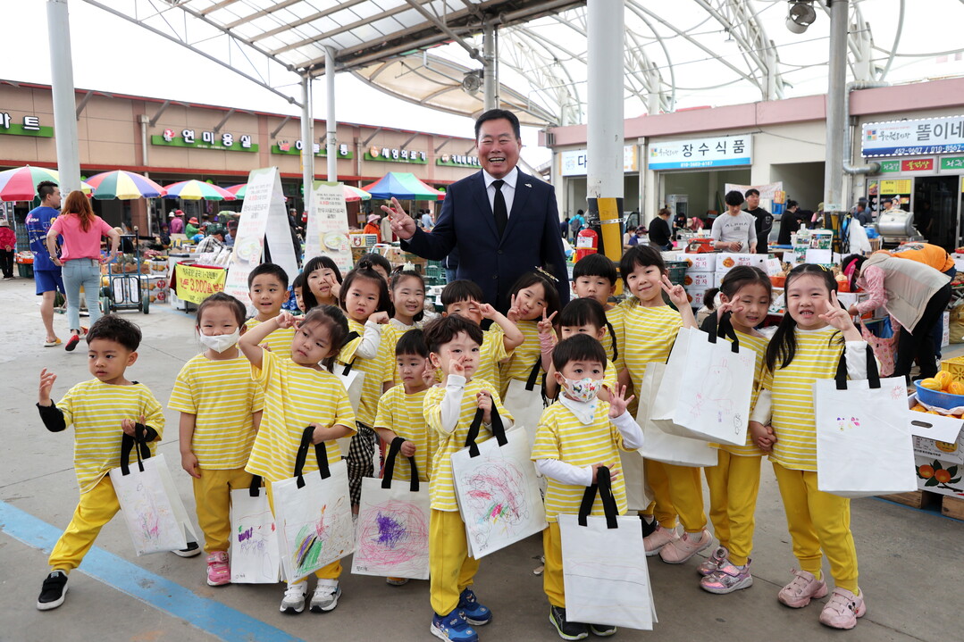 | ▲ 김산 무안군수가 무안전통시장에서 지역 어린이와 함께 장보기 체험을 갖기 전 기념 촬영을 하고 있다. [무안군 제공] |