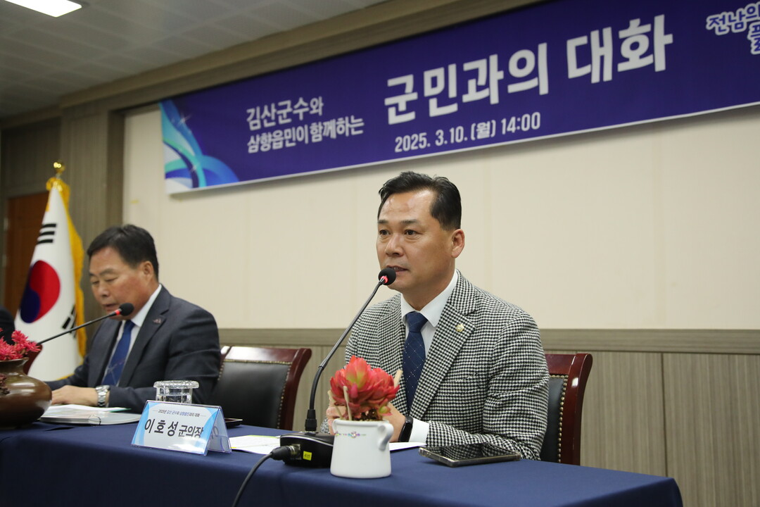 | ▲ 10일 이호성 무안군의회 의장이 삼향읍민과 함께하는 군민과 대화에서 "삼향읍민께서 제기한 숙원사업을 잘 경청해서 무안이 발전하고 행복하게 살아갈 수 있는 터전을 만들어가는데 최선을 다하겠다"는 인사말을 하고 있다. [무안군의회 제공] |