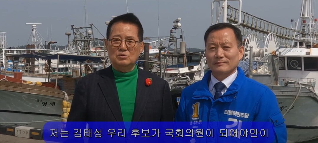 | ▲ 14일 박지원 전 원장이 전남 영암·무안·신안 지역 민주당 경선 결선에 오른 김태성 예비후보를 지지한다는 발언을 하고 있다. [유튜브 김태성TV 갈무리] |