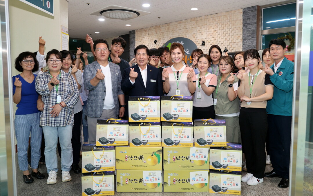 | ▲ 20일 공영민 고흥군수가 고흥종합복지센터를 방문해 위문품을 전달한 뒤 기념촬영을 하고 있다. [고흥군 제공] |