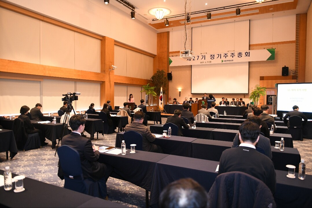 | ▲ HD현대삼호가 21일 100여 명이 참석한 가운데 '제27기 정기주주총회'를 개최하고 있다. [HD현대삼호 제공] |