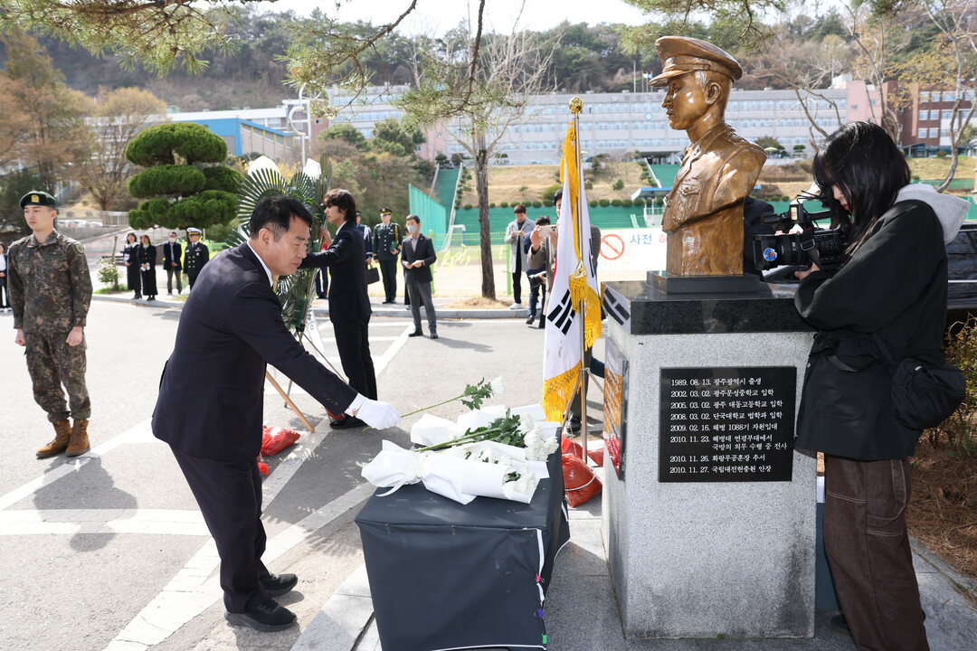 | ▲ 이정선 광주광역시교육감이 28일 연평포격전 당시 전사한 고 서정우 하사를 기리기 위해 마련된 '제10회 서해수호의 날 기념식'에서 동상에 헌화하고 묵념을 하고 있다. [광주시교육청 제공] |