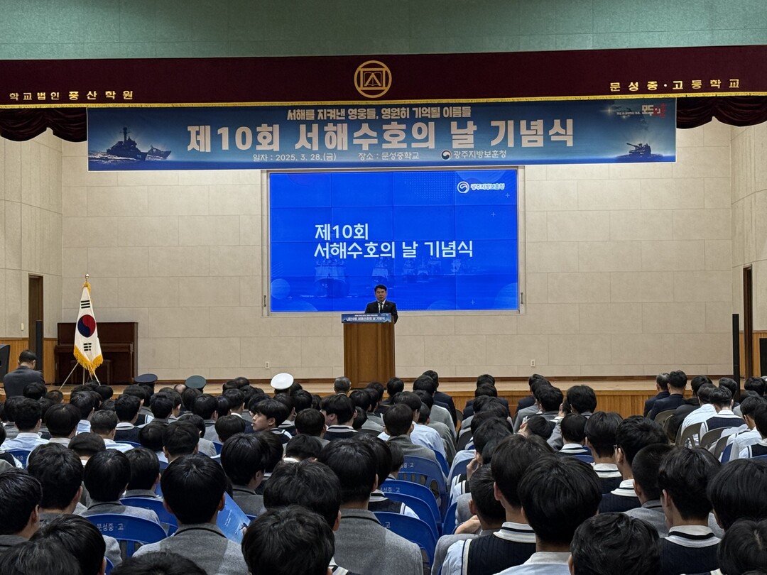 | ▲ 이정선 광주광역시교육감이 28일 연평포격전 당시 전사한 고 서정우 하사를 기리기 위해 모교인 문성중에서 개최된 '제10회 서해수호의 날 기념식'에서 추모사를 하고 있다. [광주시교육청 제공] |
