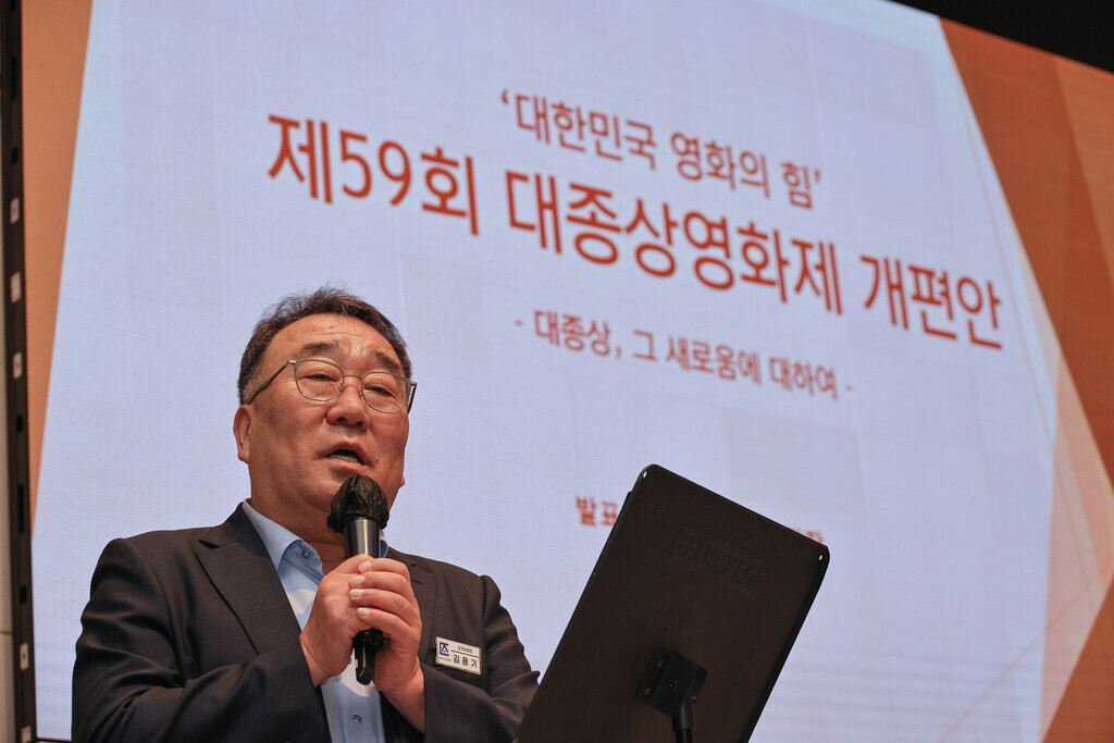 | ▲ 김용기 조직위원장이 12일 제59회 대종상영화제 미디어데이에서 개편안을 발표하고 있다. [이상훈 선임기자] |